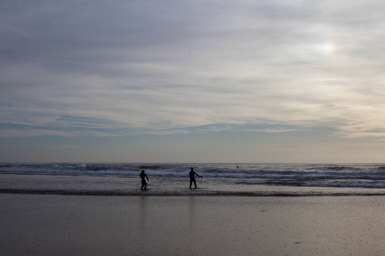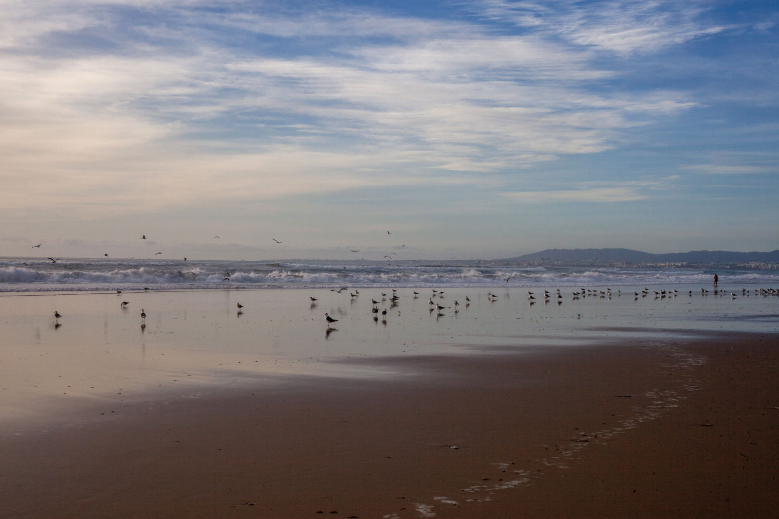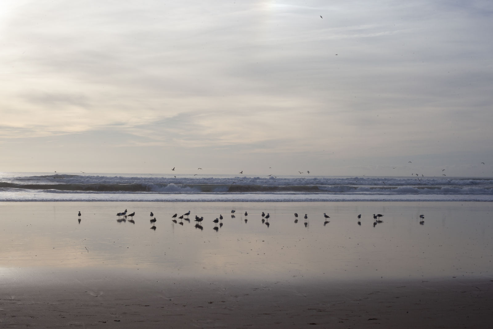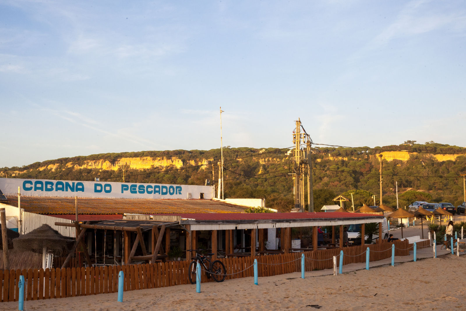 Follow the bike path parallel to the dunes and, at the edge of the afternoon, head to Praia da Cabana do Pescador. There is a shift in rhythm. The board-shacks are replaced by lounge decks. Kids are digging holes. The beach stretches wider. The light is hazy and melancholic. Myriads of sea birds drift above the sand, jumping over the waves and flying away as a swarm.