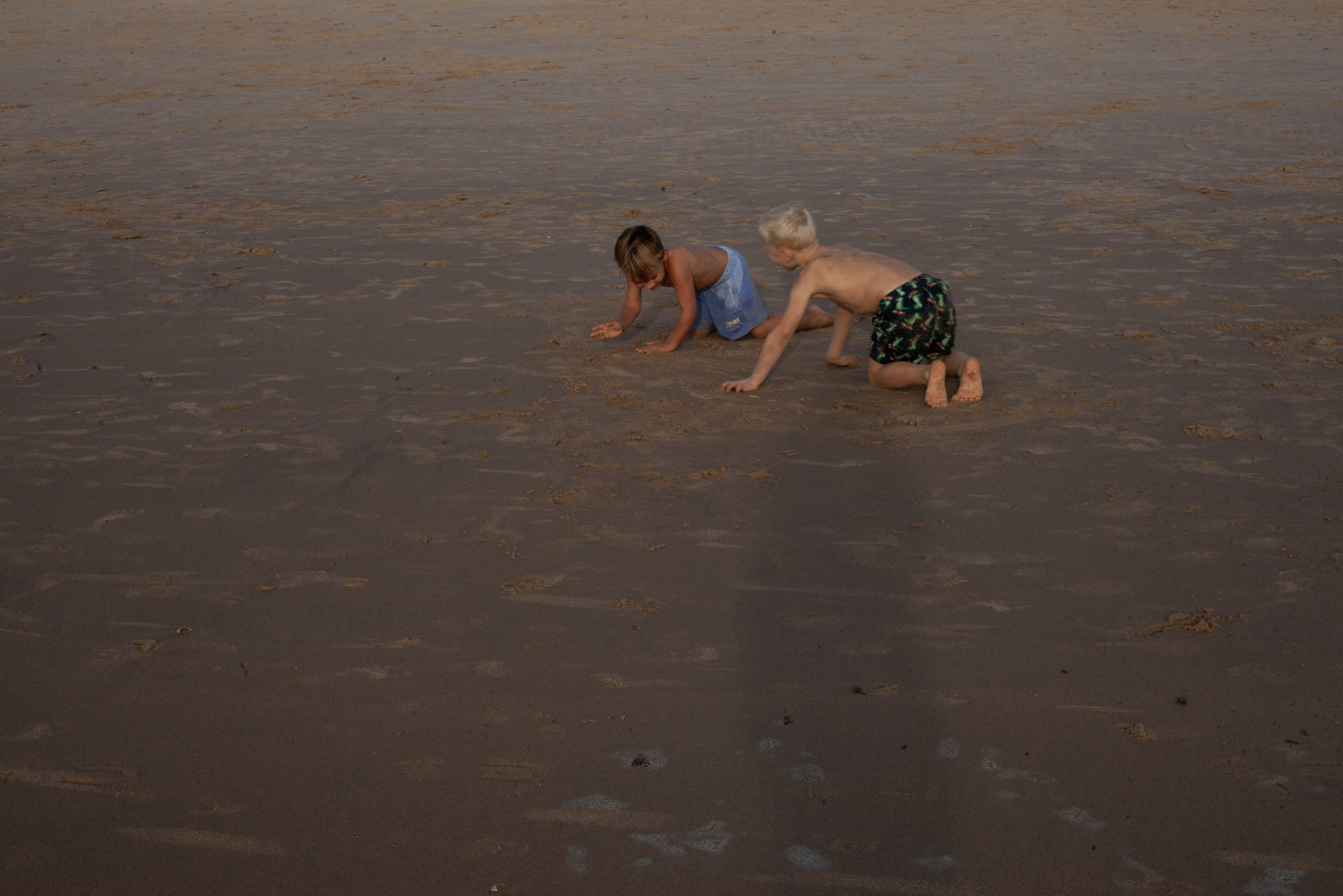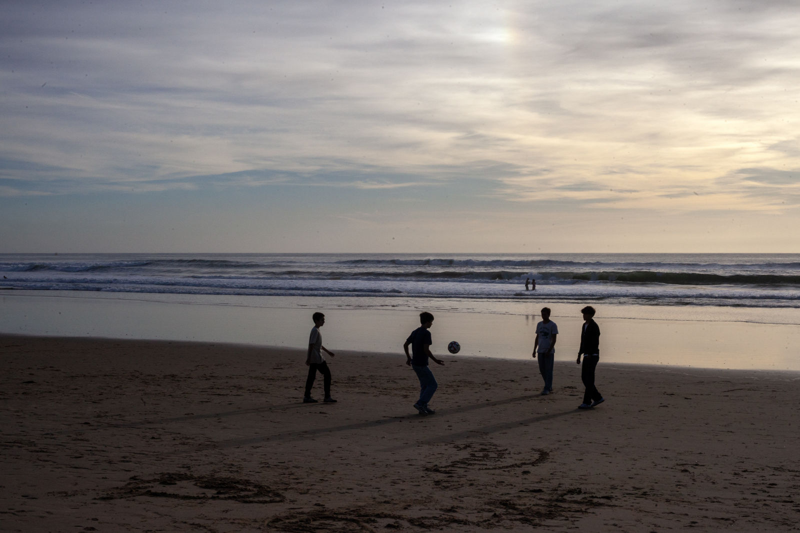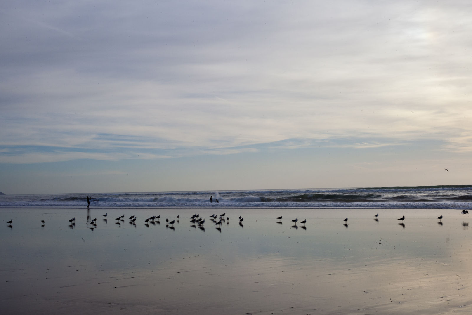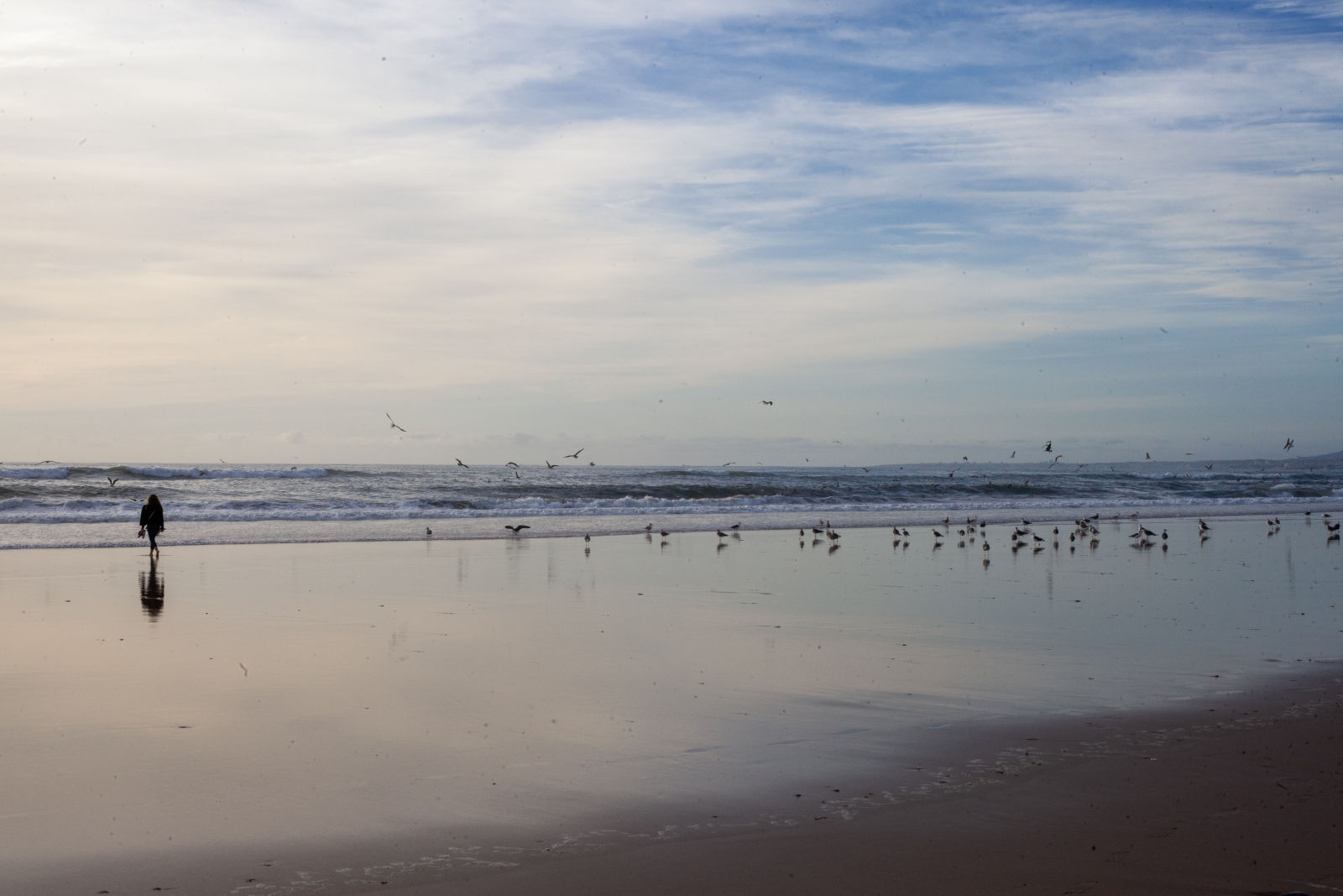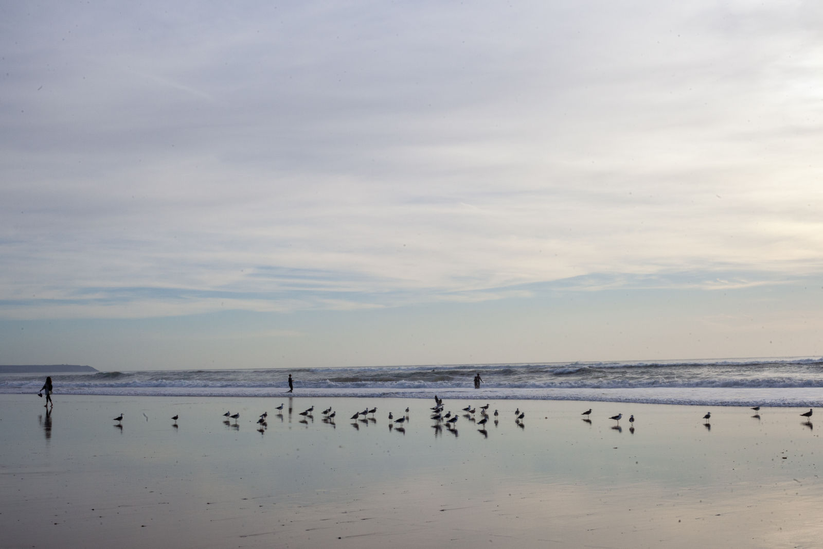 Follow the bike path parallel to the dunes and, at the edge of the afternoon, head to Praia da Cabana do Pescador. There is a shift in rhythm. The board-shacks are replaced by lounge decks. Kids are digging holes. The beach stretches wider. The light is hazy and melancholic. Myriads of sea birds drift above the sand, jumping over the waves and flying away as a swarm.